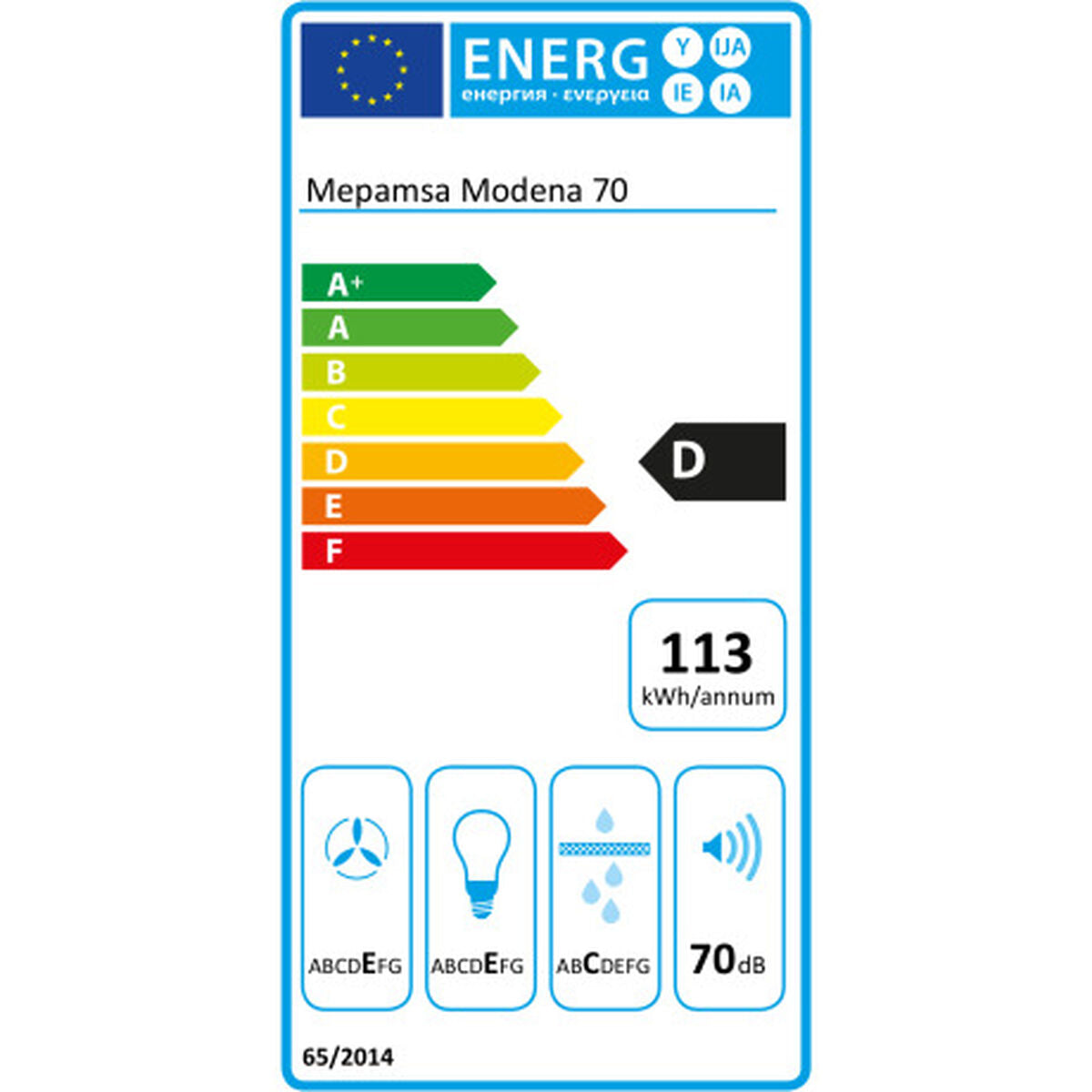 Mepamsa Modena. Noise level: 71 dB. Product colour: Stainless steel, Bulb power: 40 W, Number of bulbs: 2 bulb(s). Grease filter type: Aluminum. Motor power: 280 W. Width: 700 mm, Depth: 482 mm, Height: 150 mm